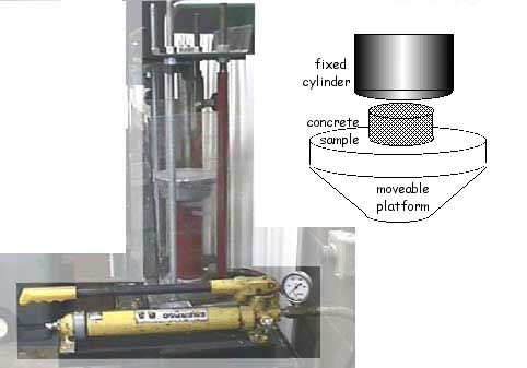 • Setup the extensometer to measure the sample elongation. • CAUTION !! Close the protective shield door before applying any force to the sample. • Apply force slowly and record the values from the force gauge and the extensometer until fracture of the sample occurs. • Calculate the tensile stress and tensile strain. Calculate Young’s modulus. • If sufficient readings were obtained, graph stress versus strain and identify the salient features of this characteristic curve. EXPERIMENT #3 Compression Test of a Concrete sample. • Using the pre-made concrete sample provided determine its outer dimensions and mass. Also calculate the volume and density of the sample. • Place the sample in the compression tester. WEAR PROTECTIVE EYEGLASSES! • Close the bleeder valve on the hydraulic pump. • Lower the hydraulic cylinder, using the pump handle, until contact with the sample is made. (ensure that contact areas above and below the sample completely cover the samples surface) • Continue to apply pressure to the sample until fracture occurs. At the point of fracture make note of the pressure reading on the pump gauge. (requires two people) • Compute the compressive stress on the sample at maximum pressure. (hint - remember you are reading pressure in pounds per square inch (psi) and you must convert to metric force per unit area) • Computing the compressive strain for a concrete sample is difficult to do accurately. State why this is so. • Compute the force acting on the concrete sample.